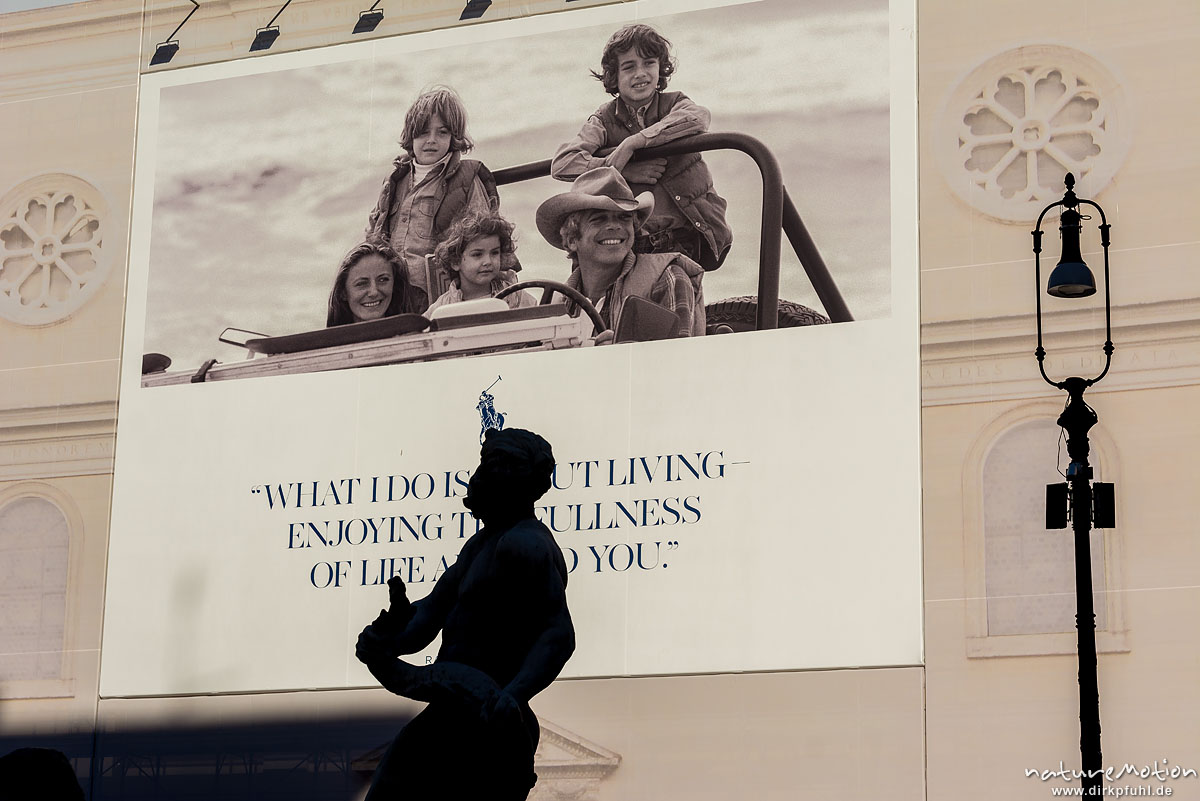 Werbeplakat an Hausfassade, Brunnen Fontana del Moro, Piazza Navona, Rom, Italien