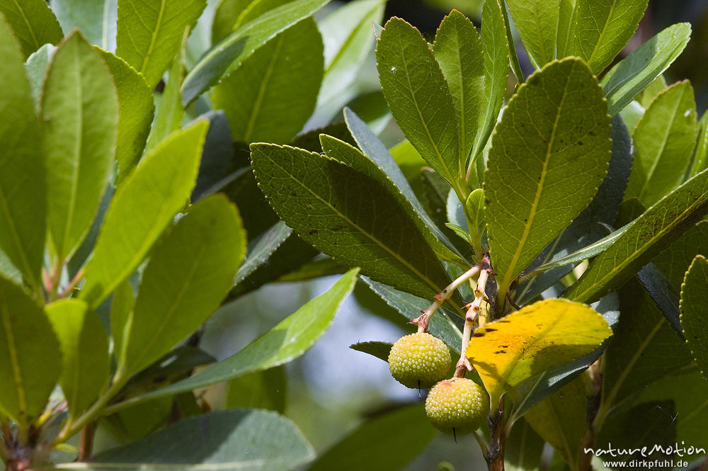 Westlicher Erdbeerbaum, Arbutus unedo, Ericaceae, Blätter und Früchte, Campingplatz Ascaghjiu, Korsika, Frankreich
