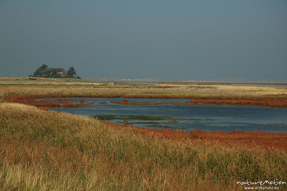 Wiesentümpel inmitten Salzwiesen, dahinter Haus Burg, Amrum, Amrum, Deutschland