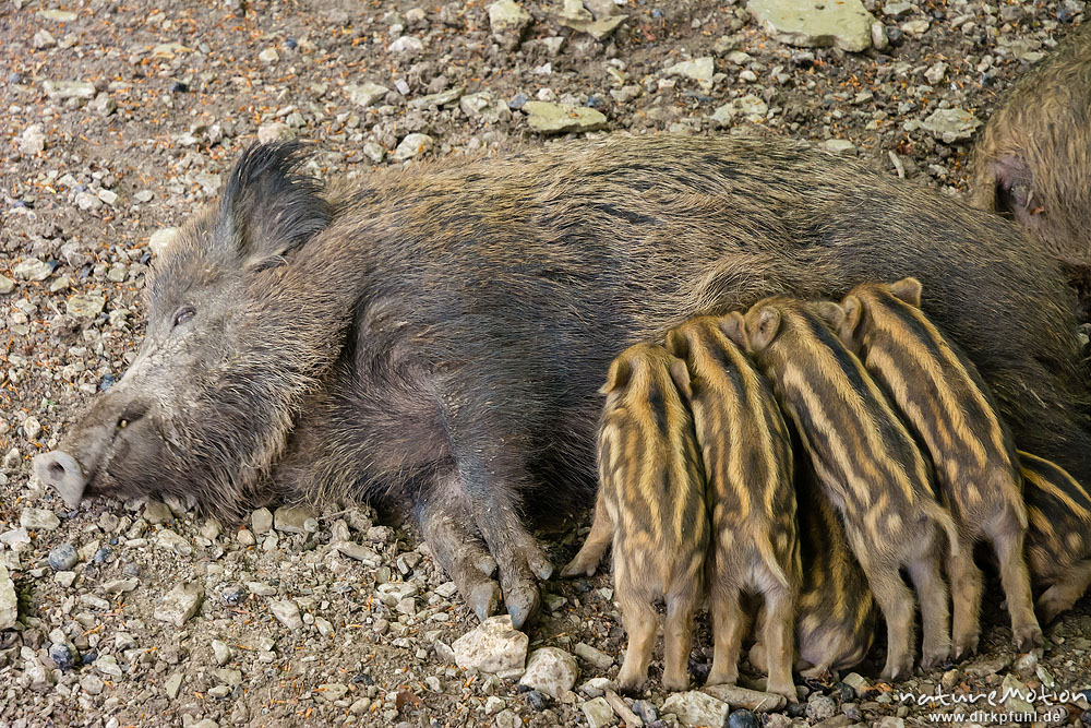 Wildschwein, Sus scrofa, Echte Schweine (Suidae), Frischlinge säugen an der Bache, Tiergehege, captive, Göttingen, Deutschland