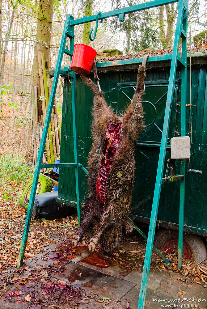 Wildschwein, Sus scrofa, Echte Schweine (Suidae), totes Tier h?ngt zum ausbluten an einem Gestell, Reiffenhausen, Deutschland