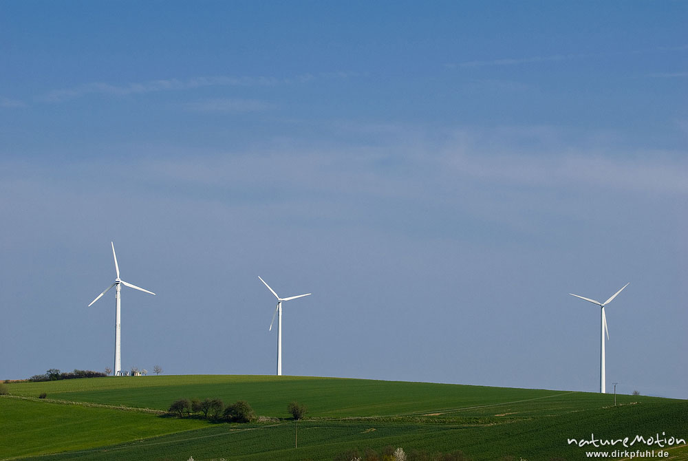 Windkraftanlagen auf Hügelkuppe vor blauem Himmel, Ebergötzen bei Göttingen, Deutschland