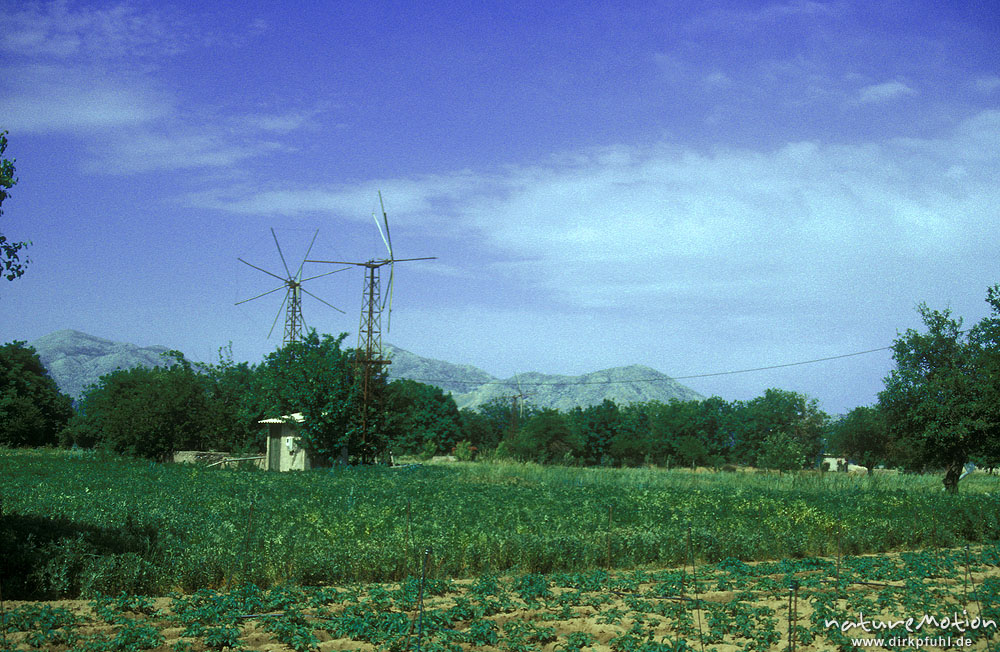 Windräder, Acker, Lassitti-Hochebene, Kreta, Griechenland