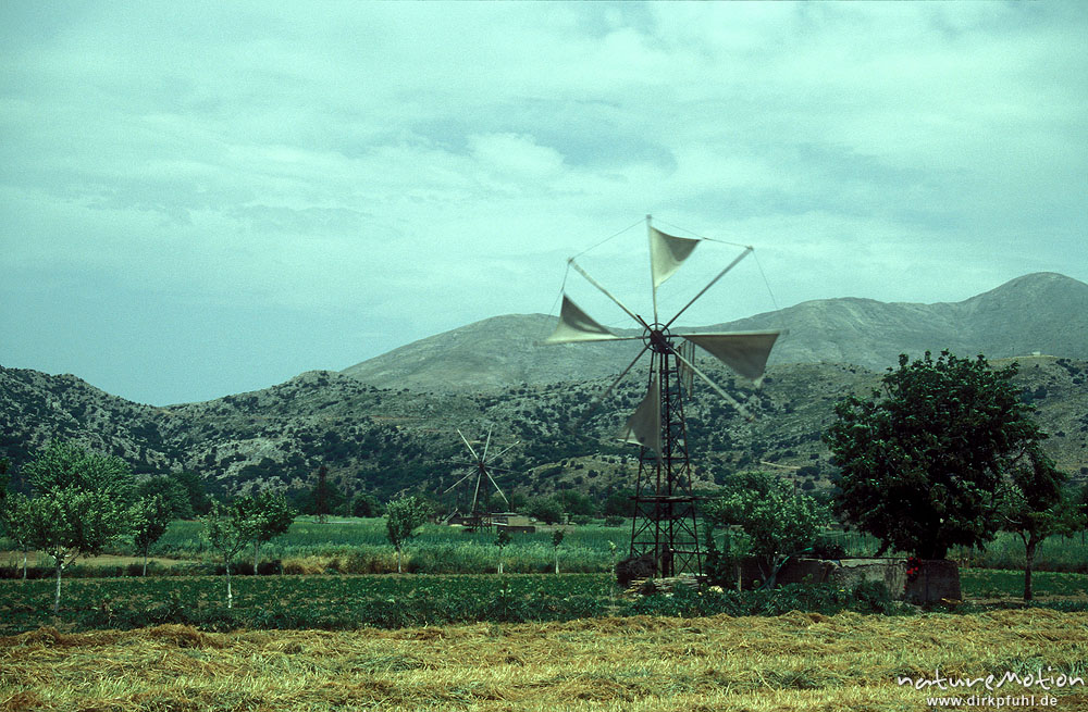 Windräder, Acker, Lassitti-Hochebene, Kreta, Griechenland