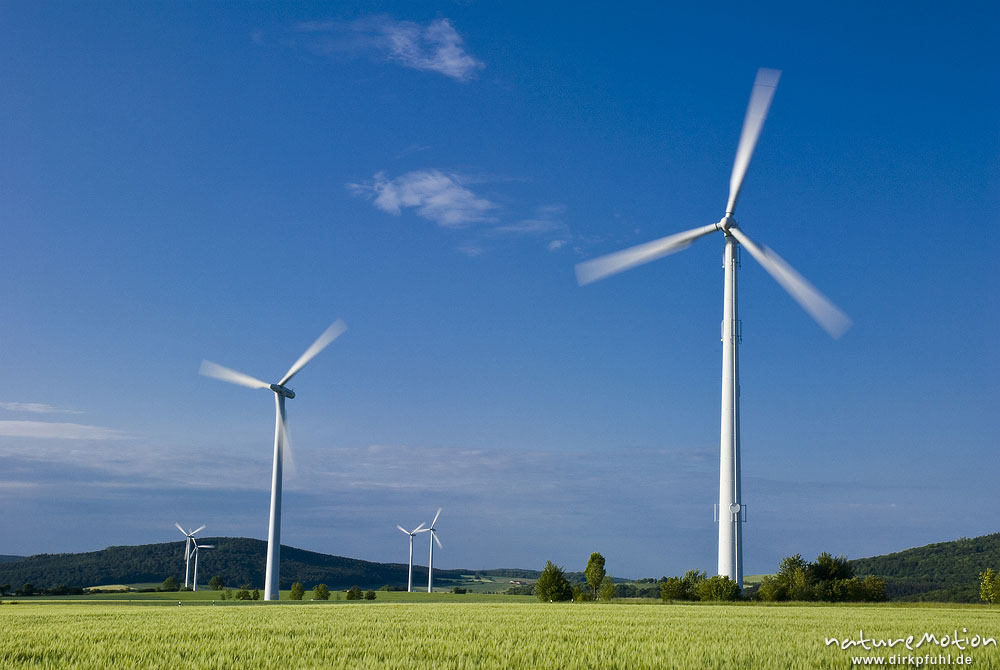 Windräder, Windkraftanlagen bei Dransfeld, Typ An Bonus 600 (früher Bonus Energy A/S, Dänemark, 2004 übernommen von Siemens), Dransfeld, Deutschland
