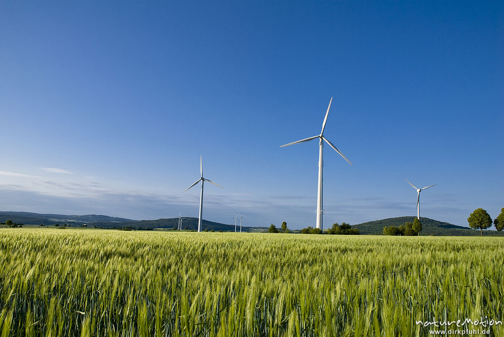 Windräder, Windkraftanlagen bei Dransfeld, Typ An Bonus 600 (früher Bonus Energy A/S, Dänemark, 2004 übernommen von Siemens), Dransfeld, Deutschland