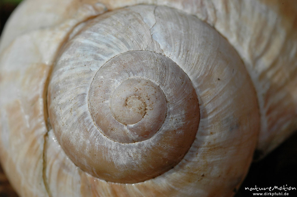 Windungen, Spirale, Gehäuse einer Weinbergschnecke (Helix pomatia) im braunen Buchenlaub, Göttinger , Göttingen, Deutschland