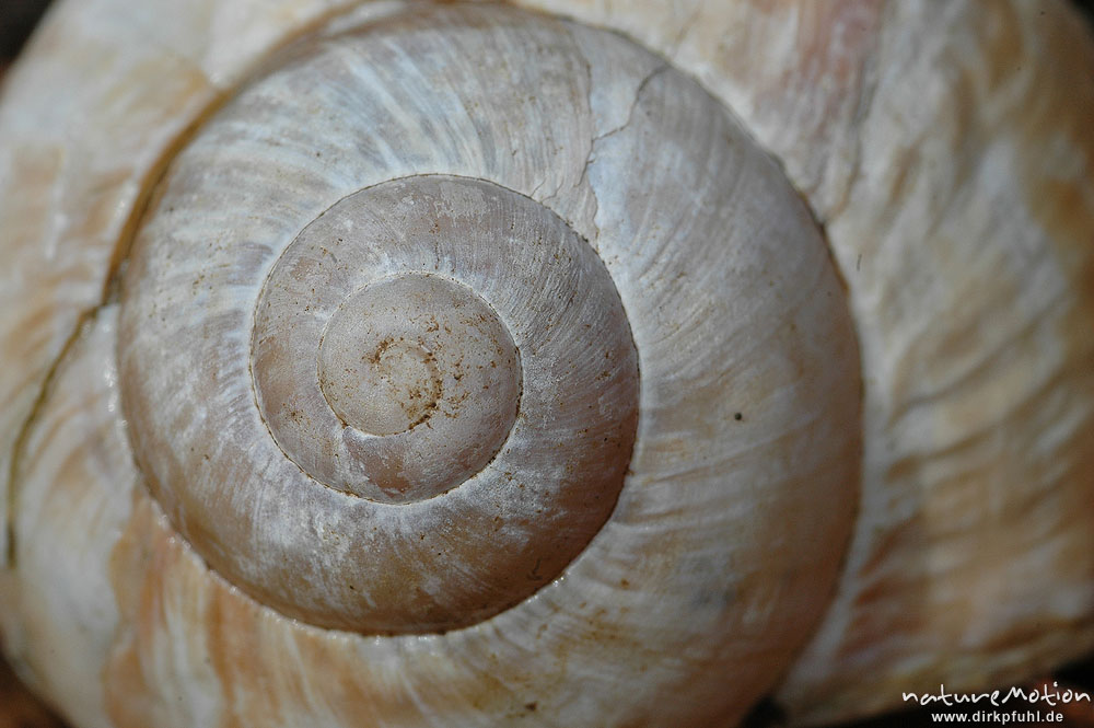 Windungen, Spirale, Gehäuse einer Weinbergschnecke (Helix pomatia) im braunen Buchenlaub, Göttinger Wald, Göttingen, Deutschland