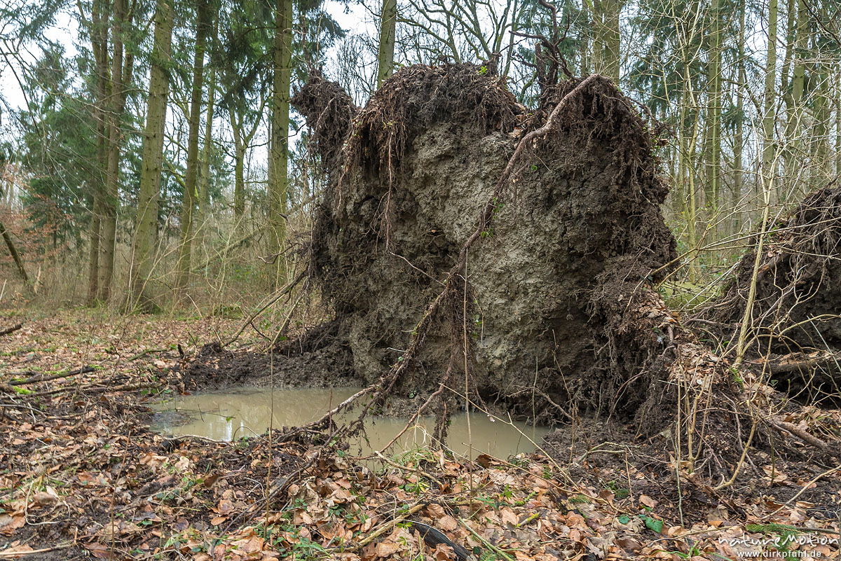 Windwurf, umgestürzte Fichten, Wurzelteller, Sturm Friederike, Göttinger Wald, Göttingen, Deutschland