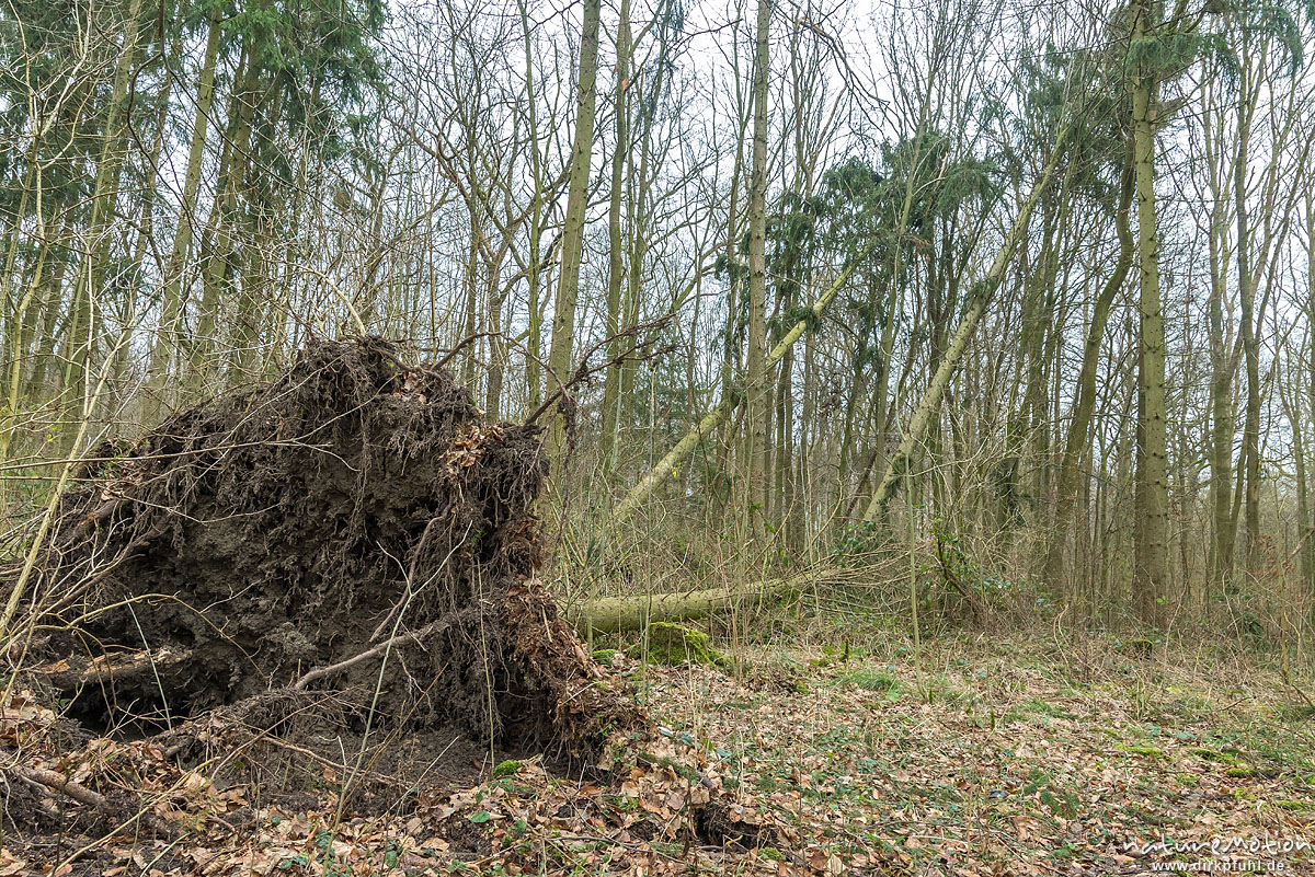 Windwurf, umgestürzte Fichten, Wurzelteller, Sturm Friederike, Göttinger Wald, Göttingen, Deutschland