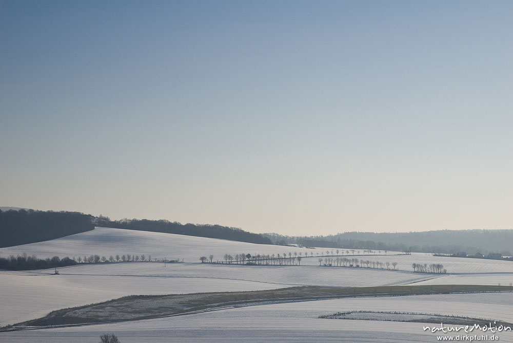 Winterlandschaft mit schneebedeckten Feldern, Feldwegen und Baumreihen, Diemarden bei Göttingen, Deutschland