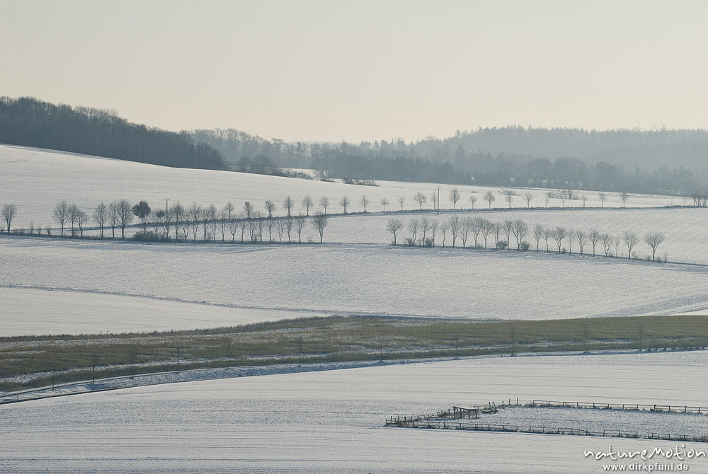 Winterlandschaft mit schneebedeckten Feldern, Feldwegen und Baumreihen Diemarden bei Göttingen, Deutschland