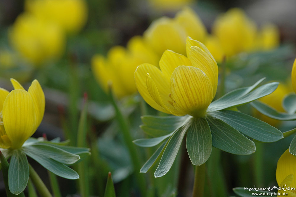 Winterling, Eranthis hyemalis, Blüte und Tragblätter, Botanischer Garten Göttingen, Deutschland