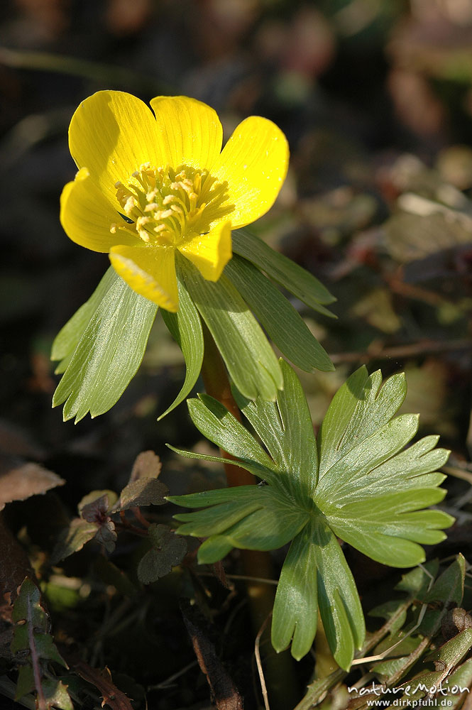 Winterling, Eranthis hyemalis, Blüten mit Tragblättern, Botanischer Garten Göttingen, Deutschland
