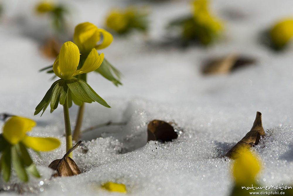 Winterling, Eranthis hyemalis, Ranunculaceae, blühende Pflanzen in geschlossener Schneedecke, Botanischer Garten, Göttingen, Deutschland