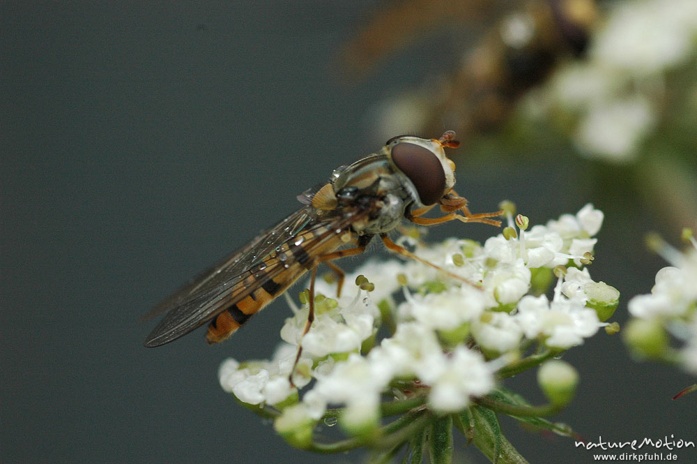 Winterschwebfliege, Hain-Schwebfliege, Episyrphus balteatus, Syrphidae, mit Regentropfen auf Doldenb, Bornholm, Dänemark