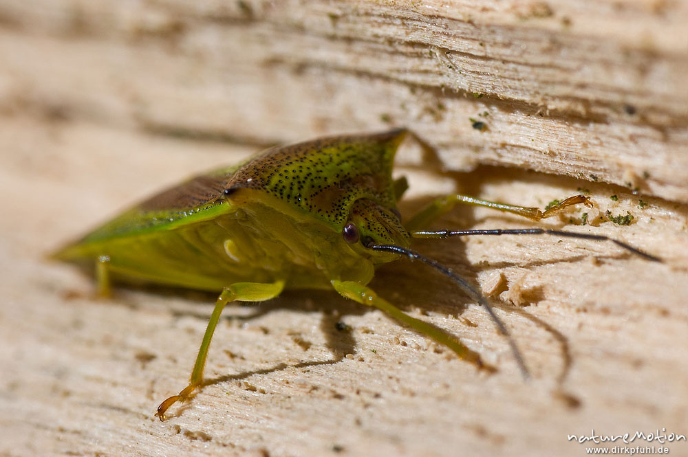Wipfel-Stachelwanze, Acanthosoma haemorrhoidale, Stachelwanzen (Acanthosomatidae), Adultes Tier auf frisch angeschlagenem Holz, Buchenwald, Settmarshausen bei Göttingen, Deutschland