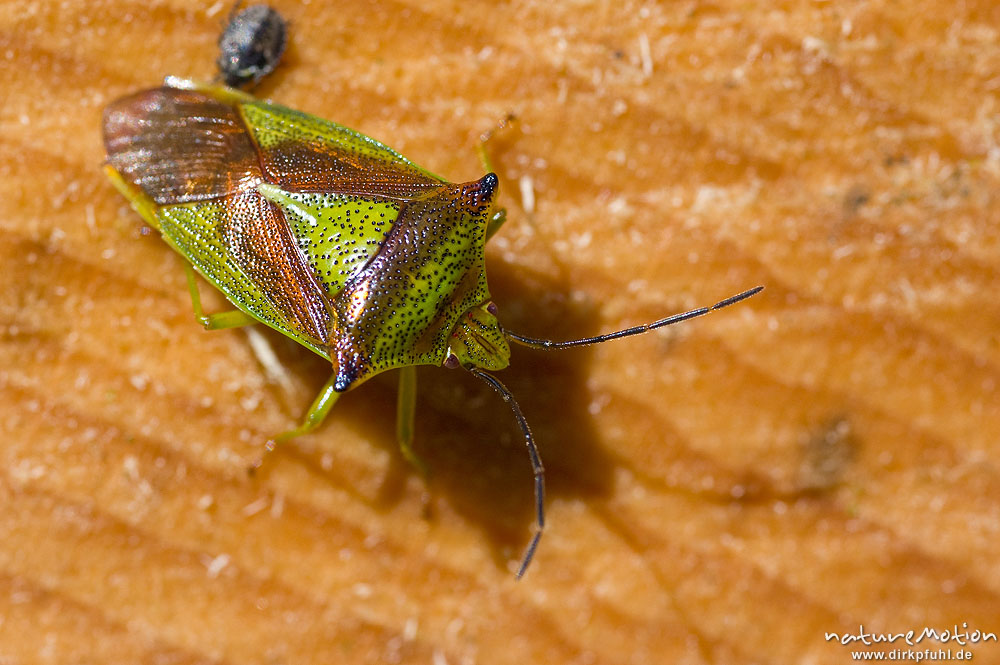 Wipfel-Stachelwanze, Acanthosoma haemorrhoidale, Stachelwanzen (Acanthosomatidae), Adultes Tier auf frisch angeschlagenem Holz, Buchenwald, Settmarshausen bei Göttingen, Deutschland