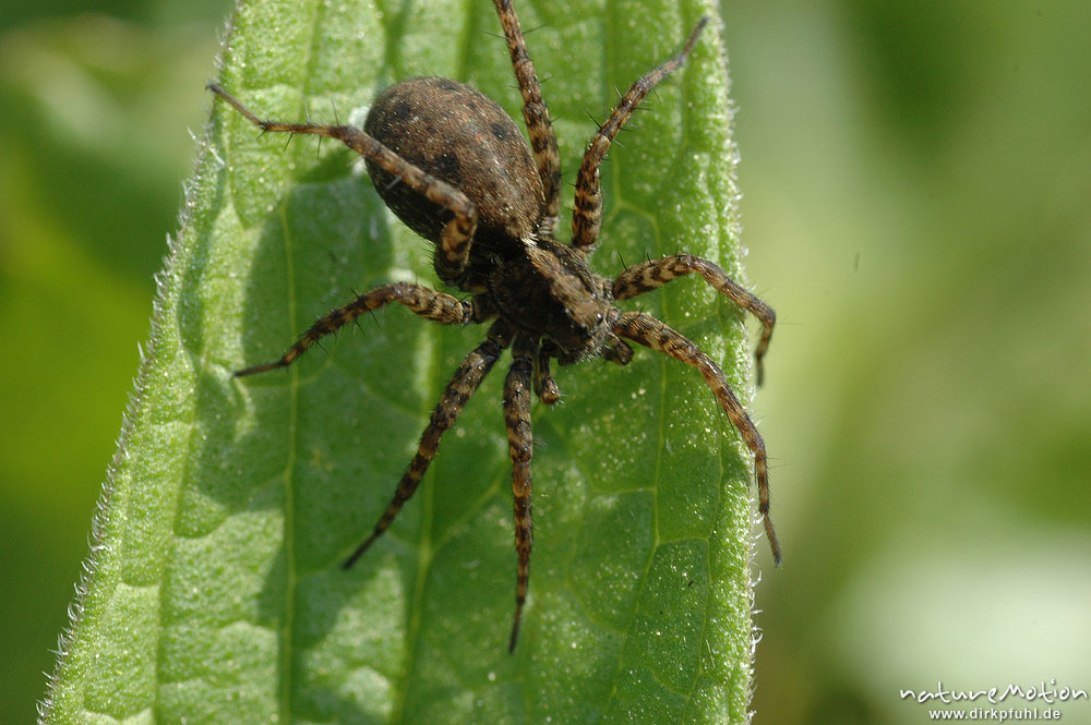 Wolfsspinne, Pardosa spec. (?), Weibchen auf Pestwurz-Blatt, Seeburger See, Deutschland