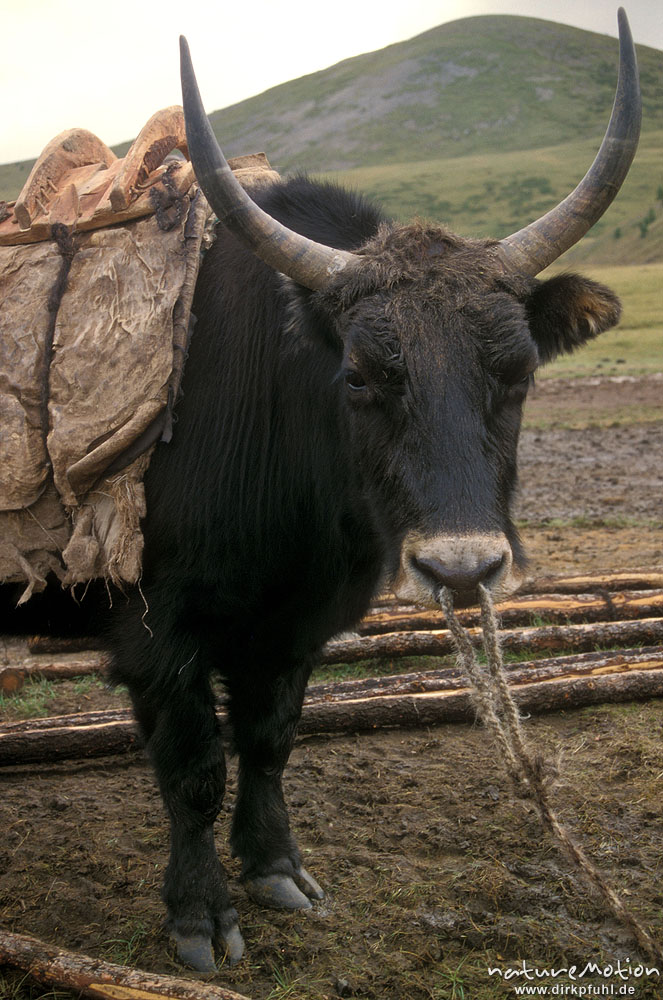 Yak, Bos grunniens, Bovidae, Bulle mit Sattel in Gehege, Chowsgöl Nuur, Mongolei