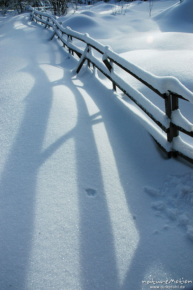 Zaun, schneebedeckt, Schattenwurf, Torfhaus, Harz, Deutschland