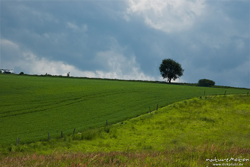 Zaun trennt Getreidefeld von Weide, Obstbaum, Witzenhausen, Deutschland