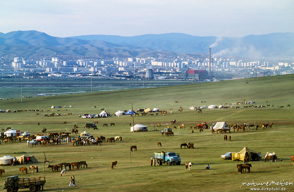 Zeltstadt bei Yarmag, im Hintergrund Skyline von Ulaanbaatar ,