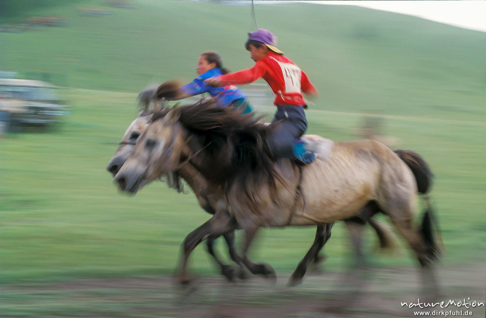 Zieleinlauf der Reiter, Kopf an Kopf Rennen , Mongolei
