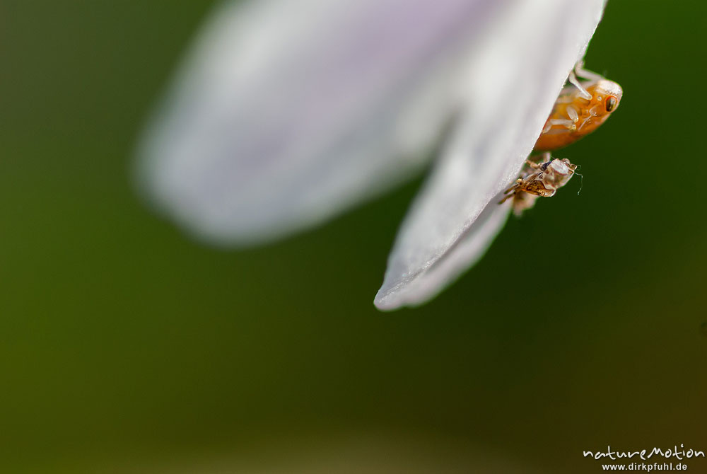 Zikade, Larve an der Unterseite einer Blüte, frisch geschlüpft, daneben alte Larvenhaut, Exuvie, Westerberg, A nature document - not arranged nor manipulated, Göttingen, Deutschland