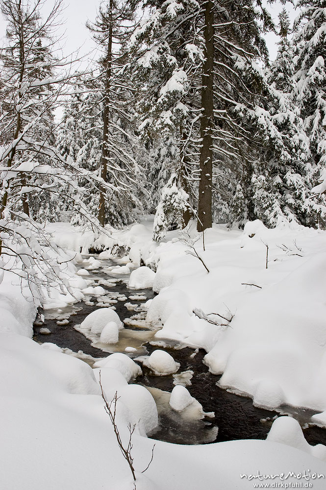 zugefrorener Bachlauf, Oder oberhalb des Oderteichs, Harz, Deutschland