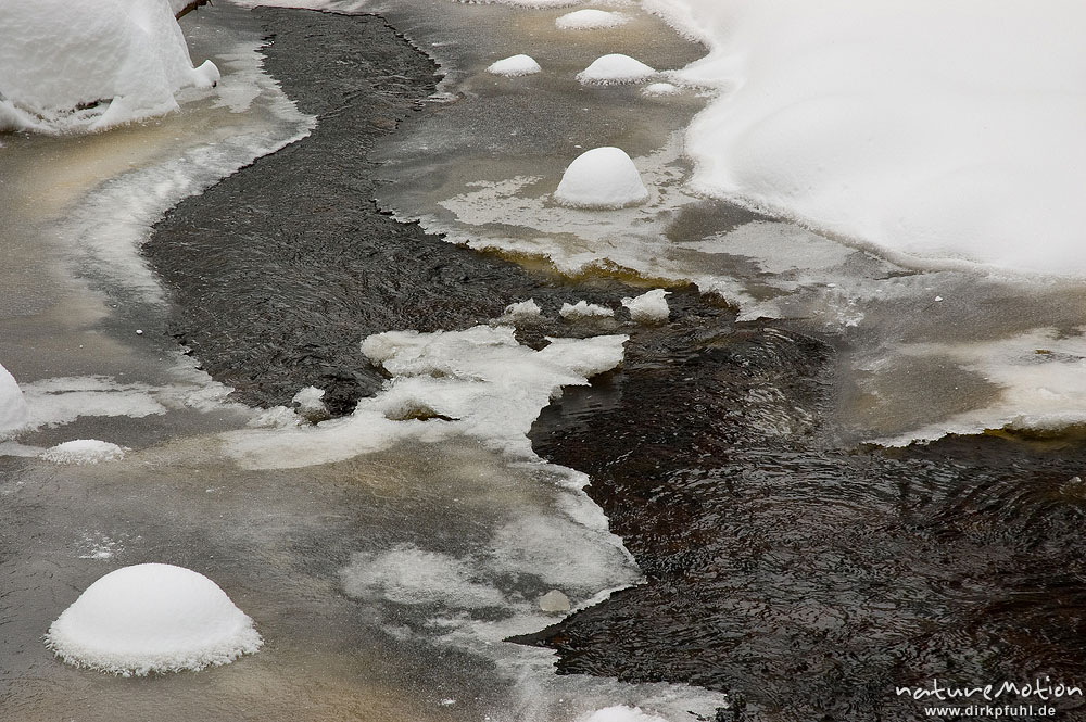 zugefrorener Bachlauf, Oder oberhalb des Oderteichs, Harz, Deutschland