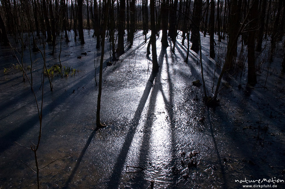zugefrorener Erlenbruch, Schattenwurf der Baumstämme, Herberhäuser Stieg, Göttingen, Deutschland