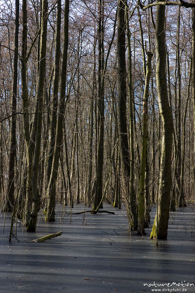 zugefrorener Erlenbruch, Schattenwurf der Baumstämme, Herberhäuser Stieg, Göttingen, Deutschland