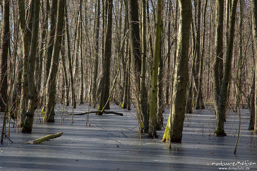 zugefrorener Erlenbruch, Schattenwurf der Baumstämme, Herberhäuser Stieg, Göttingen, Deutschland