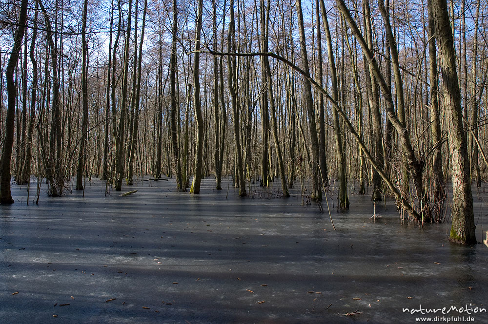 zugefrorener Erlenbruch, Schattenwurf der Baumstämme, Herberhäuser Stieg Göttingen, Deutschland