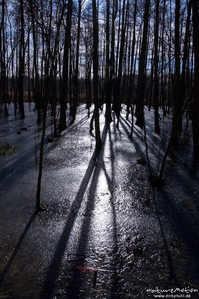 zugefrorener Erlenbruch, Schattenwurf der Baumstämme, Herberhäuser Stieg, Göttingen, Deutschland