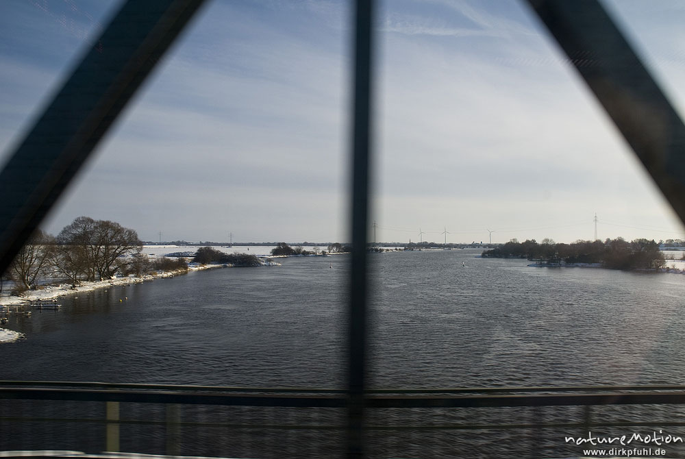 Zugfahrt über die Weser, Strecke Bremen - Osnabrück, Brückenstreben, Flusslauf, Winterlandschaft, Bremen, Deutschland