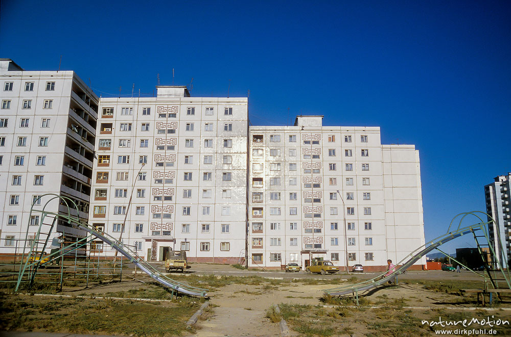 zwei Rutschen, Kinderspielplatz inmitten Plattenbau-Siedlung Ulaanbaatar - Ulan Bator, Mongolei