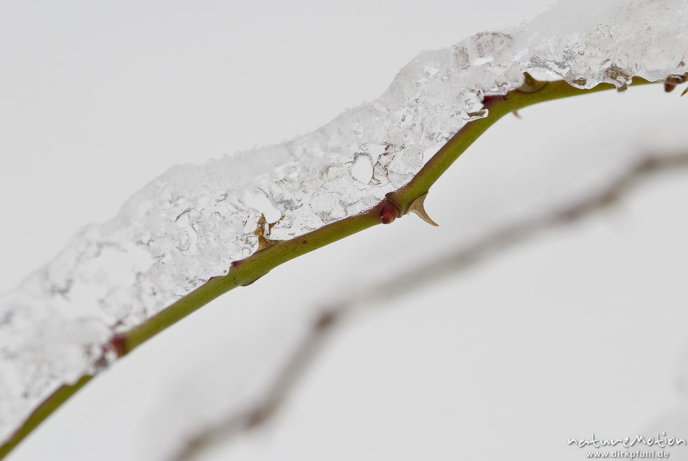 Zweig einer Brombeere (Rubus sectio Rubus) mit Haube aus Eis und Dornen, Kerstlingeröder Feld, Göttingen, Deutschland