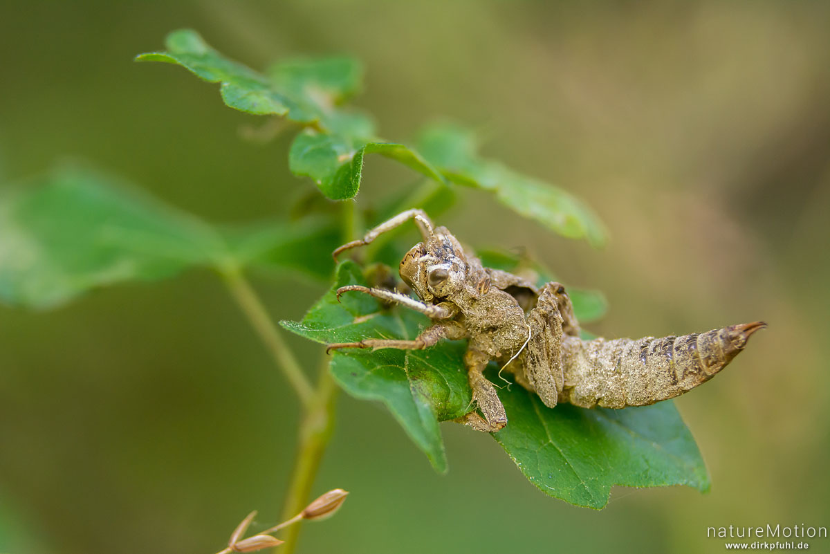 Zweigestreifte Quelljungfer, Cordulegaster boltonii, Cordulegasteridae, Exuvie auf Ahornblatt, Bacht, Saignon – Provence, Frankreich