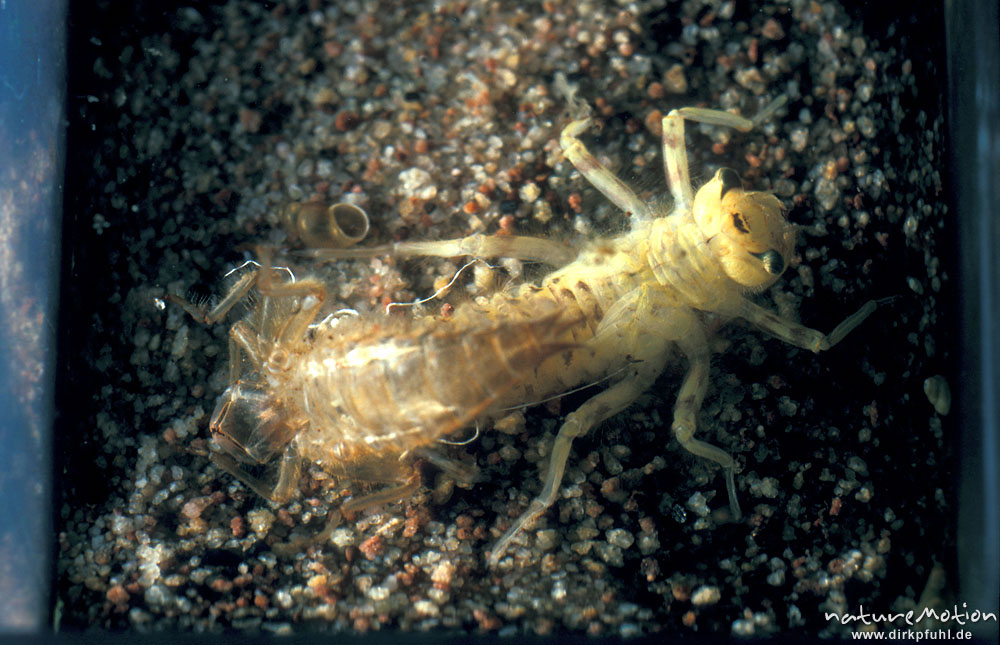 Zweigestreifte Quelljungfer, Cordulegaster boltonii, Cordulegasteridae, Larve, Häutung in das 12. Stadium, Aquarium, ,
