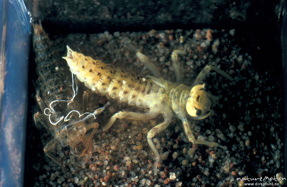Zweigestreifte Quelljungfer, Cordulegaster boltonii, Cordulegasteridae, Larve, Häutung in das 12. Stadium, Aquarium, ,