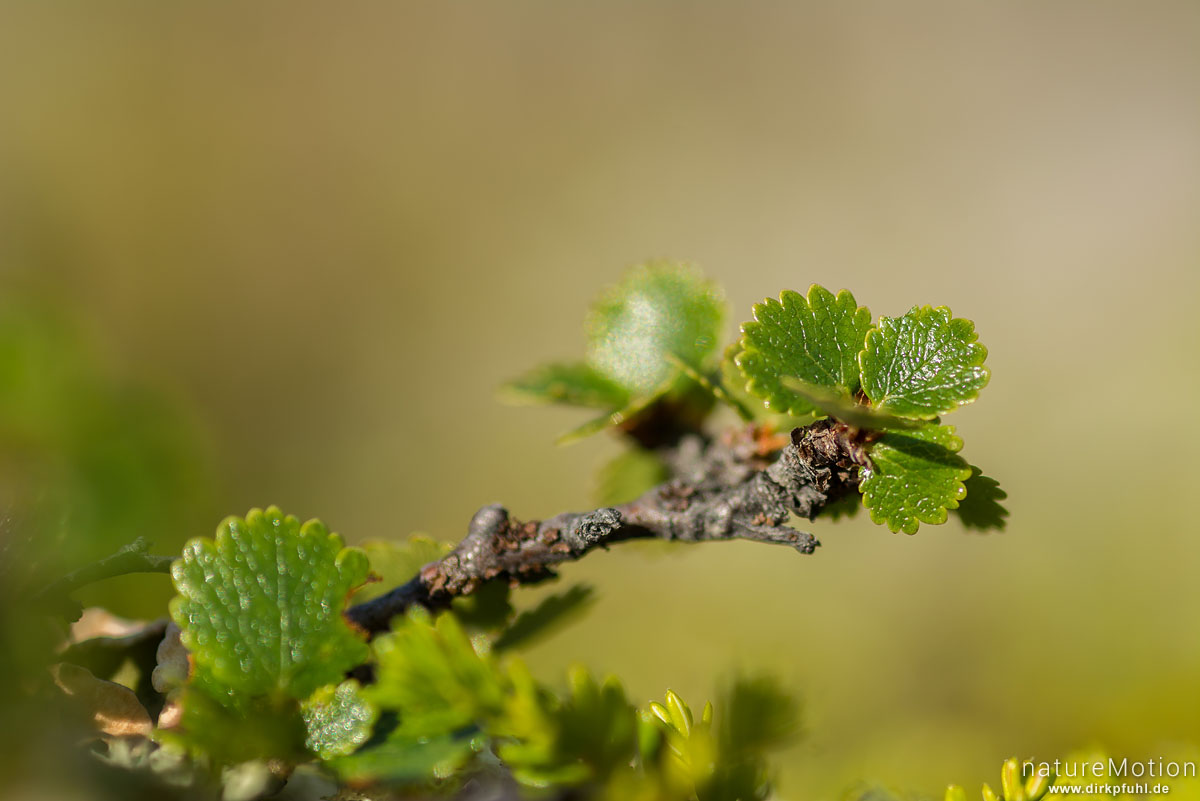 Zwerg-Birke, Betula nana, 	Birkengewächse (Betulaceae), Zweig mit Laubblättern, Memurudalen, Jotunheimen, Memurubu, Norwegen